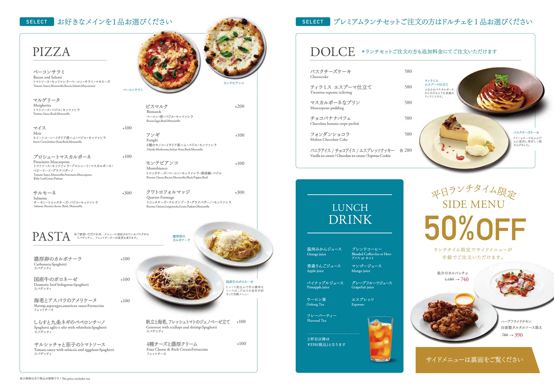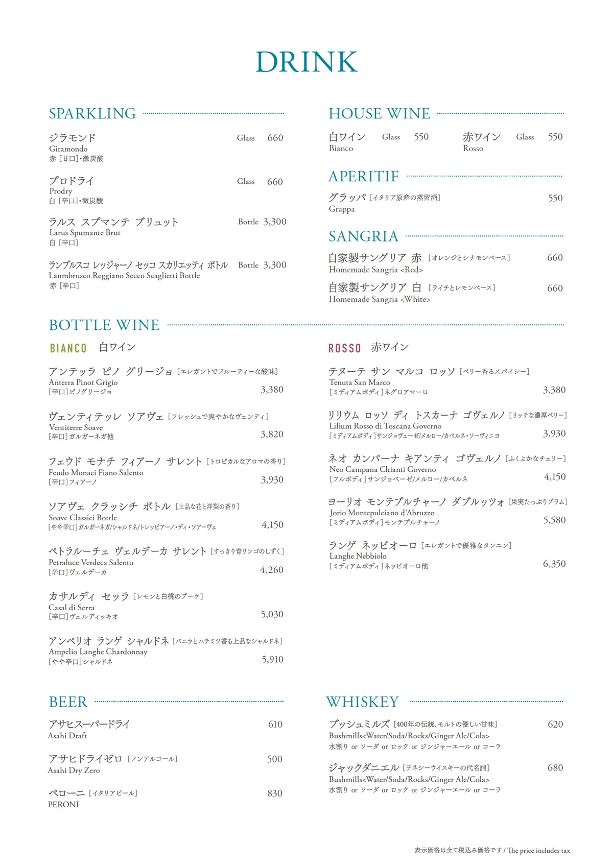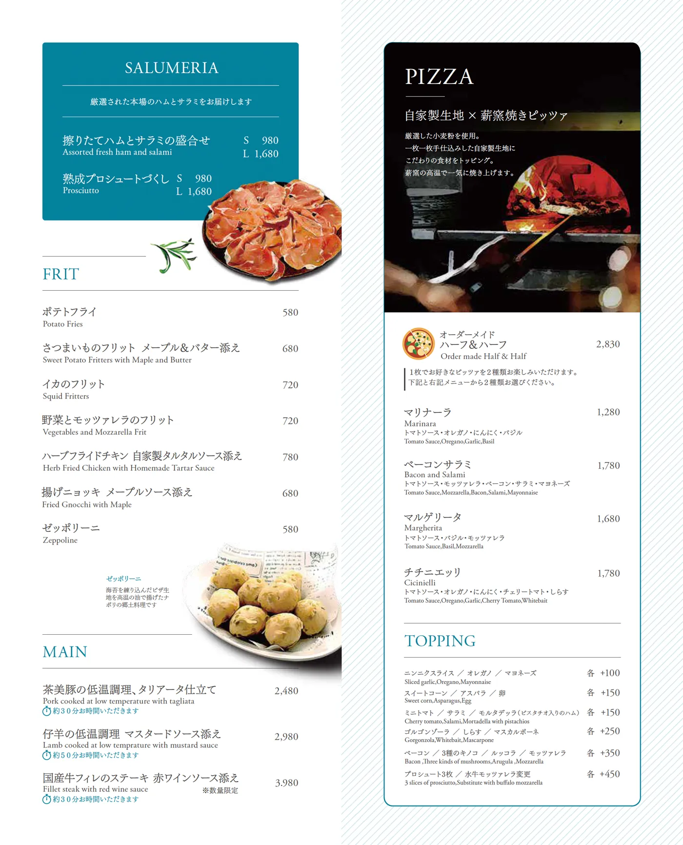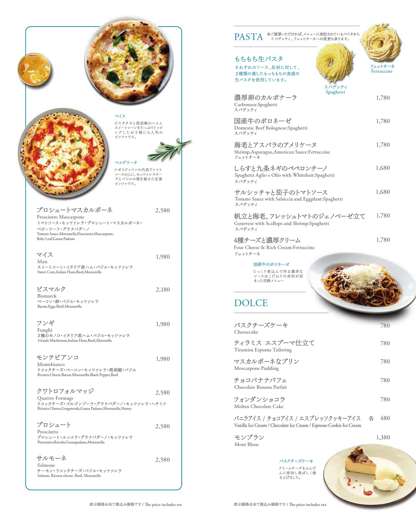 自慢のピッツァは、イタリア産の小麦粉を使用しています。生地は職人が一枚一枚手仕込みし、厳選した食材をトッピング。本場ナポリから直輸入された薪窯で、高温で一気に焼き上げます。ほかにもイタリアから取寄せたサラミや、イタリアビール「ペローニ」を始め、ワインやシャンパンもイタリア産を揃えています。お好きなお飲み物と一緒に、もちふわの絶品ピッツァや本場のサラミをご賞味ください。
