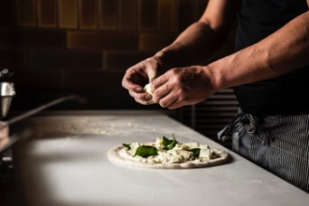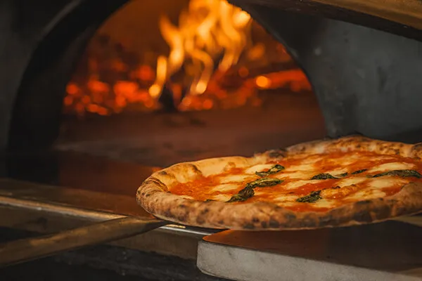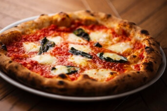 「もちふわ」が特徴のナポリ風ピザは、約30㎝のピザ生地に、イタリア産の風味豊かなトマトソースと、イタリア産モッツァレラチーズをのせ、約400度の薪窯で焼き上げます。生地は職人が一枚一枚手仕込みし、窯の温度を熟練の技で管理。全ては「美味しい1枚」を届けるために、こだわり抜いたピッツァです。