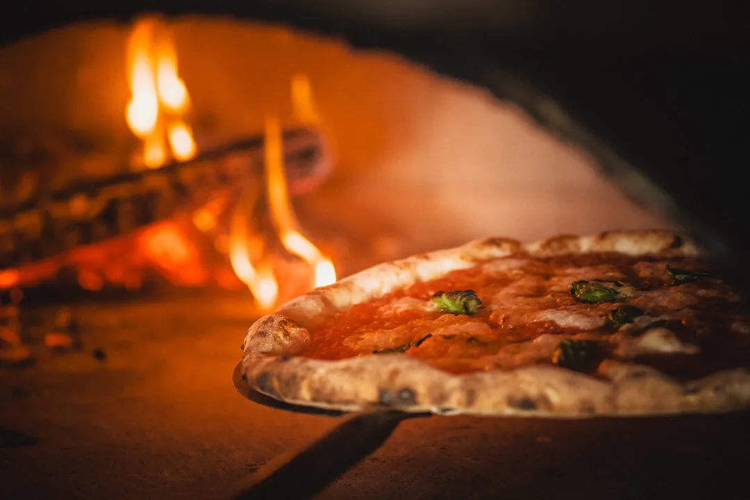 「もちふわ」が特徴のナポリ風ピザは、約30㎝のピザ生地に、イタリア産の風味豊かなトマトソースと、イタリア産モッツァレラチーズをのせ、約400度の薪窯で焼き上げます。生地は職人が一枚一枚手仕込みし、窯の温度を熟練の技で管理。全ては「美味しい1枚」を届けるために、こだわり抜いたピッツァです。